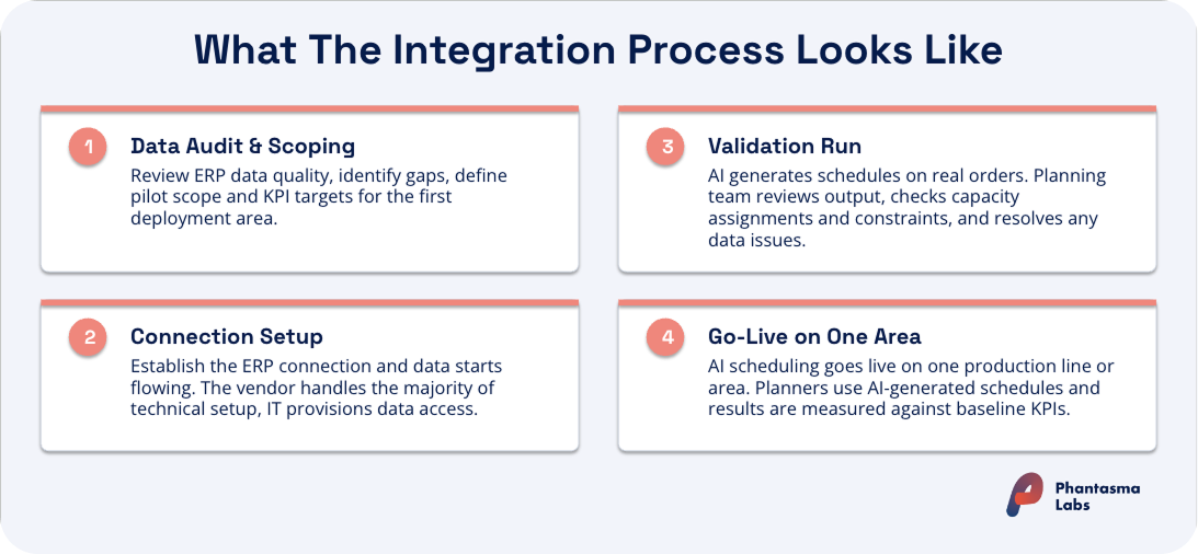 Most standard production scheduling AI ERP integration projects run in four phases: